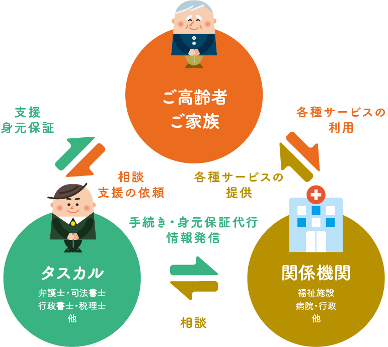 特定非営利活動法人タスカルは、ご家族・ご親族に代わって身元保証サービス(入居・入院など)、健康・安否確認などのサポート、財産管理サポート、エンディングサポートを行っております。